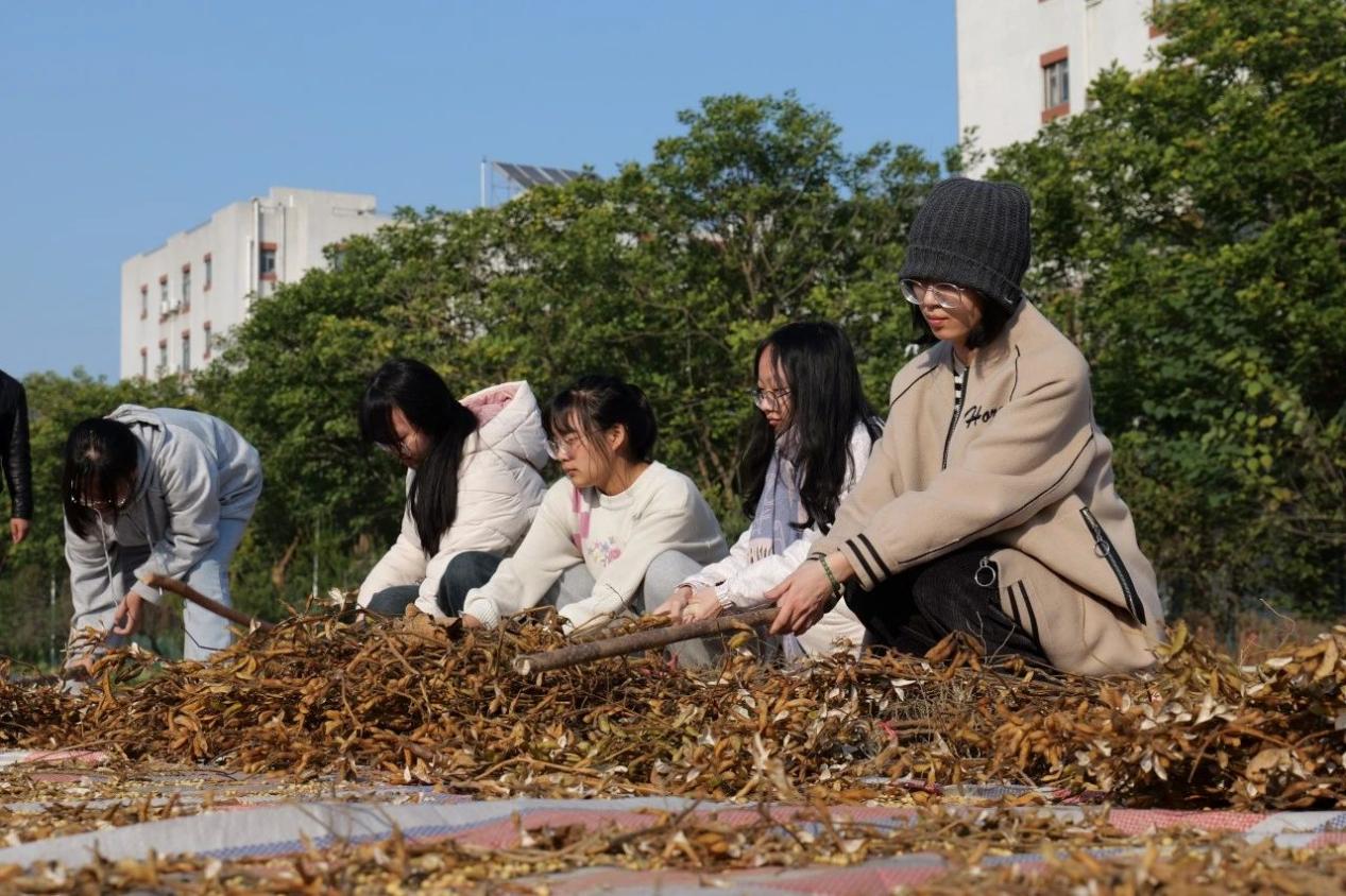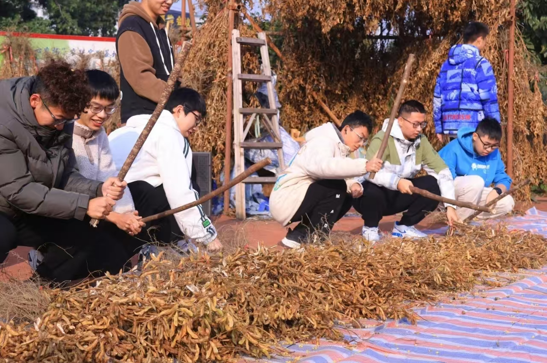 黄豆完全晾干后,1000余名同学先后走进农场,共同见证“种豆得豆”的丰收时刻。黄豆加工的第一步是“敲打出豆”。