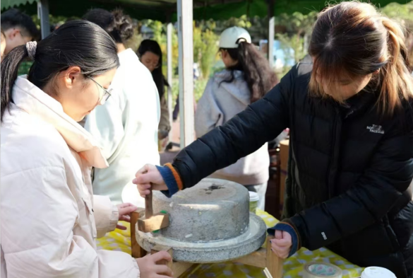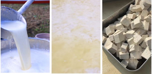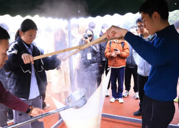 现场设置了传统手工豆坊,在指导老师的帮助下,同学们复刻传统工艺下豆浆、豆花、豆腐的制作过程。