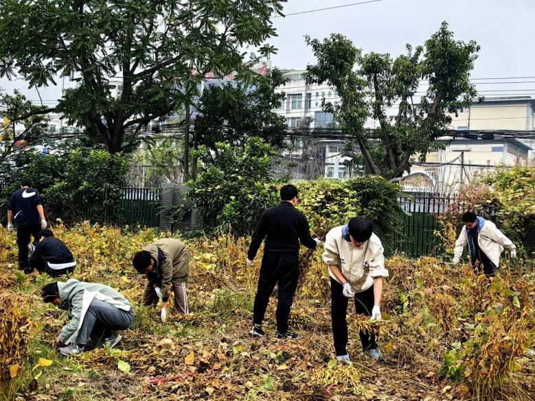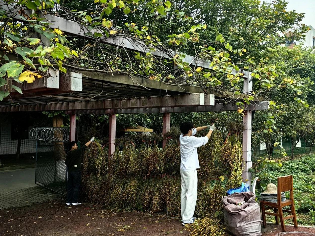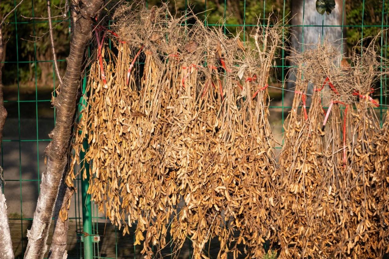6月,同学们亲手种下黄豆,历过半年除草、施肥的精心管护,粒粒饱满的豆荚挂满枝头。11月,豆田泛起金黄,奏起丰收的旋律。同学们干脆利落地拔出成熟的豆秆,几棵捆成一扎,倒挂在拉杆上,开始“晒秋”行动。