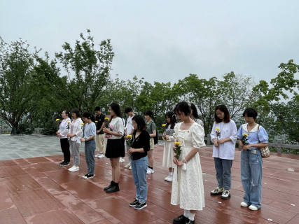 参观完江竹筠故居后,师生来到红梅雕塑广场致敬英烈。广场上,江姐雕像朝着东方,象征江姐永远跟党走的革命精神,江姐将永远是广大青年学习的榜样。在江姐雕像前,同学们沉静默哀,深深鞠躬,敬献鲜花,重温入党誓词,表达对江姐的崇高敬仰,表达新时代青年坚守初心、勇担使命的意志和决心。