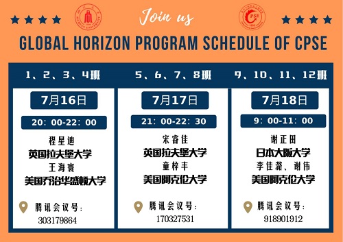 疫情期间,为加强本科生对海外深造的了解,7月16日-18日,学院通过云端联线互动会议的方式举行“Global Horizon program”,邀请在美国、英国、日本等海外高校攻读硕博士学位的留学生校友,为学院2018级、2019级本科生做了三场留学专题讲座。