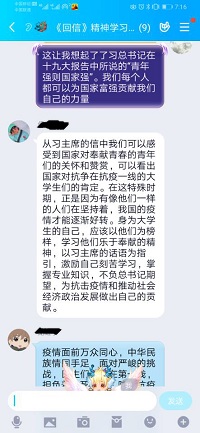 化学工程学院党委组织全体青年学子尤其是党团员、学生骨干学习习近平总书记重要回信精神,并利用腾讯会议、QQ电话等平台,组织线上多轮专题研讨。同学们在QQ群积极讨论学习心得,表达自己要牢记习总书记嘱托,“珍惜学习时光,练就过硬本领,到人民最需要的地方去”。有的同学满怀激情,亲笔写下了对前线医护人员的感谢与祝福。同学们一致表示,总书记的回信让大家更加坚定了战胜疫情、守护家园的信心,更加下定在校期间发奋学习、毕业之后响应祖国号召的信念与决行。