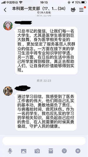 2019级药学专业本科生杨子潇同学说:“习总书记的回信饱含着对广大学子的关怀与期望。正值疫情期间,无数青年医者奋战救护一线,与死神较量、和时间赛跑,用无畏的“逆行”践行着最动人的医学生誓言。疫情就像一面镜子,折射出人性的温暖和医者的担当,他们身上那份对祖国人民的爱,令我肃然起敬,一瞬间仿佛明白了什么是‘党和人民信赖的好医生’。青年是民族的未来与希望,我们应当有建功立业新时代的远大志向,担负起时代使命,做一个真正对国家和人民有益的人。”