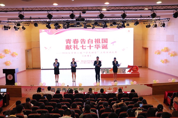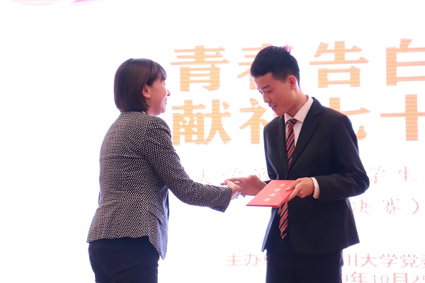 思想理论青年研习社胡志伟等4名同学带来的《祖国啊,我亲爱的祖国》诗朗诵拉开了比赛序幕。选手们围绕“青春告白祖国,献礼七十华诞”,或铿锵有力、慷慨激昂;或娓娓道来、低吟浅唱,倾诉着对祖国深沉的爱意,现场掌声不断。来自艺术学院的周煜瑶同学对比海内外影视市场,认为源远流长的华夏文明有着完全不输给好莱坞的题材宝藏,道出了树立文化自信是传承中华悠久文明的重要前提;来自建筑与环境学院的单子祺同学从收看70周年阅兵式上满载革命老兵的彩车入题,表达了要以共产党人的凛然正气为榜样接续奋斗;来自华西药学院、出身军人家庭的蒙潇同学满怀敬意,以优良家风的重要性为视角讲述了青年人的使命感;来自华西公共卫生学院的艾力库提·艾尔西丁同学,则以家乡新疆风貌巨变和荣获“人民英雄”国家荣誉称号的英模公安干警艾热提·马木提的事迹,讲述所受到的洗礼...... 活动过程中,还进行了以新中国革命建设历程中重大史实为背景的知识问答和“微信墙”抽奖,主持人与观众们踊跃互动。师生们通过“微信上墙”的方式真诚表达着自己对祖国的美好祝愿,现场氛围活泼而融洽。