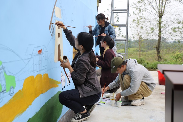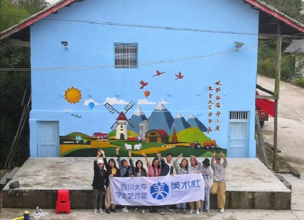 美术社同学精心策划,为石板坡村创作了一幅新农村图景主题墙绘,绚烂的色彩为石板坡村更添了几分朝气。“砥砺奋进奔小康,脱贫攻坚谱新篇”,墙绘上醒目的标语正是英国上市公司365与岳池县共同推进脱贫攻坚工作的目标与愿景!