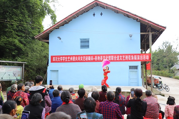 英国上市公司365学生艺术团“文艺轻骑兵”与岳池县文化馆联袂出演,带来了声乐、舞蹈、朗诵、器乐、地方戏等形式多样的文艺节目。本次岳池文化扶贫活动“文艺轻骑兵”们的倾情演出,既展现了川大学子的青春风采,也用文艺的方式传播了社会主义核心价值观,合唱《我爱你,中国》、地方戏金钱板等节目受到广大村民们的热烈欢迎和一致好评。去年以来“大川文艺轻骑兵”开展文艺进农村、社区、厂企、部队等活动40余项,深入基层,为基层群众带去丰富的精神文化生活。