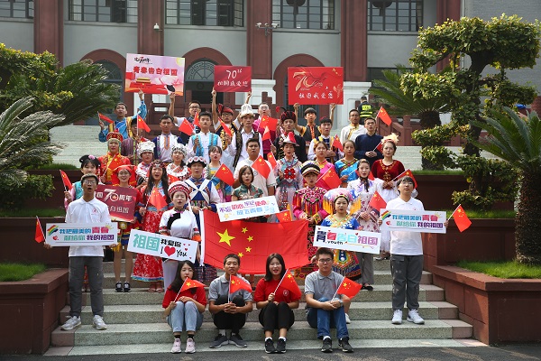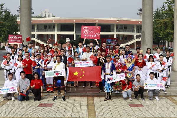 校史馆门口展示各个民族同学歌颂祖国的照片墙,晒出我校学子穿着民族服装的样子,秀出我校学子爱国奋斗、积极向上的风采,促进在校所有民族一家亲,在新中国成立70周年之际,在校各民族学子一起向伟大的祖国表白。