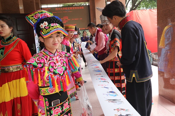 化学工程学院锡伯族2017级博士吴一凡同学说:“从2011年来到川大,如今已是第九个年头,这是我第一次参加各民族共庆国庆的活动。非常荣幸能代表锡伯族的川大学子参加庆祝新中国成立70周年的活动,感受多彩的民族文化,结识不同民族的朋友们。当看到印有自己照片的民族照片长卷展开的那一刻,心中充满的不只是激动,对承载我九年青春与回忆的母校的祝福,对日益强大的伟大祖国母亲的祝福,全在注目中,无须言语。”