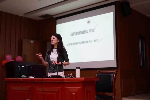 (学院党委副书记悦洋为新生做题为《自我的构建与丰富》的专题报告)