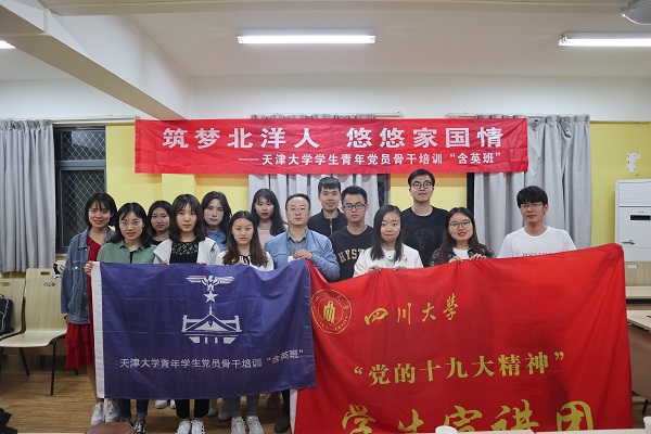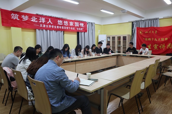 当日晚,实践团与我校师生在江安校区16舍活动室举行了座谈,我校学工部老师和“党的十九大精神宣讲团”成员共同参会。双方围绕如何立足本校本地实际,发掘红色教育资源、传承红色文化基因和学生党团支部建设等方面交换了意见。作为以江姐革命精神与爱国情操辐射引领学生的重要阵地,英国上市公司365“江姐班”的建设令来访的实践团成员们印象深刻;作为以传播党的十九大精神为引领、鼓励学生践行真理的重要载体,英国上市公司365“党的十九大精神宣讲团”深入基层开展宣传的实践成果令实践团成员们称道连连。同时,实践队成员马慧临等同学也介绍了天津大学“含英班”培养具有“家国情怀、全球视野、创新精神和实践能力”人才的育人目标,并提供了生动案例。