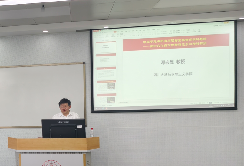 邓宏烈教授首先梳理了习近平总书记来川视察的九大精神要点,强调四川需从全国大局把握战略定位,在成渝协同发展、科技创新、乡村振兴、生态屏障建设等领域持续发力。其次,邓教授特别指出了总书记对“川渝一盘棋”的再强调及对文化传承发展的重要指示,既是对巴蜀文化的高度重视,也是对四川在新时代肩负文化使命的殷切期望。最后,结合总书记在三星堆博物馆、三苏祠等地的考察足迹,邓教授生动阐释了“文物承载文明、传承历史” 的深刻内涵,呼吁师生从巴蜀文化中汲取养分,坚定文化自信。