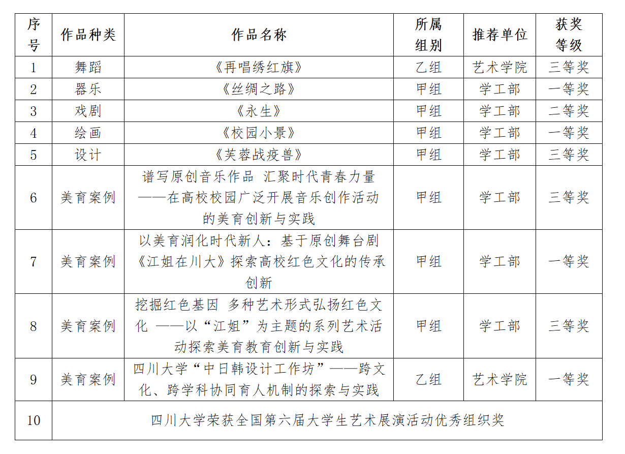 2021年5月6日—13日,由教育部和四川省人民政府共同主办的全国第六届大学生艺术展演活动在成都顺利举办。本届大艺展活动以“奋斗、创新、奉献”为主题,是教育系统为中国共产党建党100周年献礼的一项重要活动,旨在推出一批具有地方特色、时代特征、校园特点和大学生特质的主题文艺作品,集中展现全 国大学生志向远大、朝气蓬勃、昂扬向上的精神风貌。