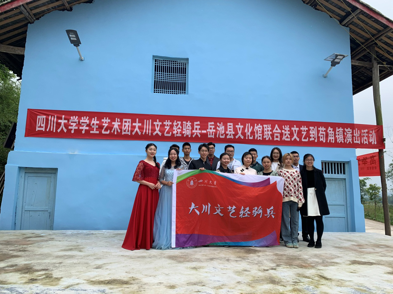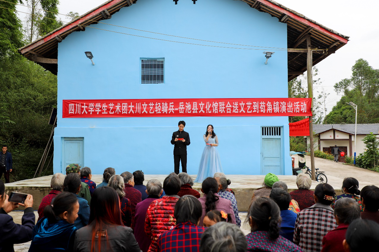 10月17日是国家扶贫日,为践行党的十九大精神,坚定信念,不忘初心,丰富和活跃农村群众文化生活,将优质文化资源送到基层,传递积极向上的思想和观念,10月13日,学生艺术团“大川文艺轻骑兵”30名师生深入广安市岳池县苟角镇石板坡村,与岳池县文化馆联合献上了精心准备的文艺演出,并开展了美术社墙绘活动。此次活动既是川大师生助力基层扶贫、振兴乡村的躬行实践,亦是庆祝新中国70周年的青春献礼。