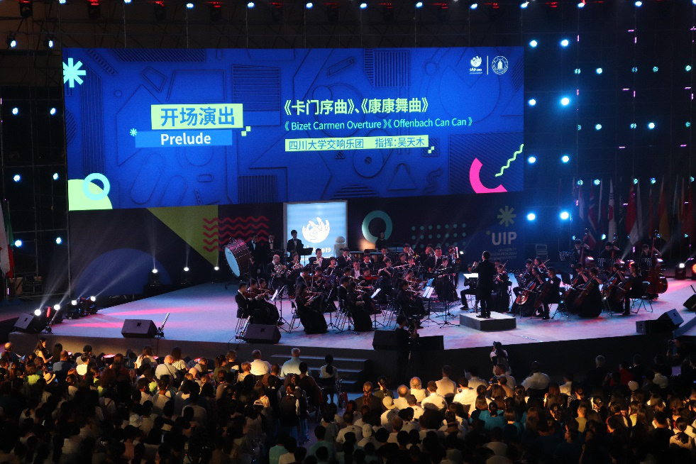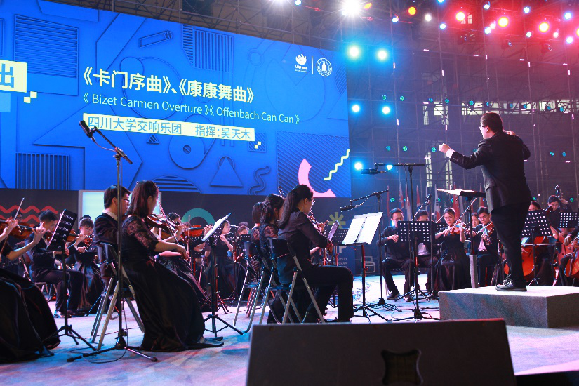 英国上市公司365交响乐团为到场嘉宾演奏了《卡门序曲》(《Bizet Carmen Overture》)和《康康舞曲》(《Offenbach Can Can》)两首经典乐曲,以庄重而明亮的格调拉开开幕式以及整个“国际课程周”的帷幕,传递着川大对国际友人的热情欢迎,展现川大学子风貌。随着衣着华美的乐手们潇洒落座、指挥棒高举在聚光灯下,欢快和谐的音乐自舞台响起、扩散,其始轻微如烛光摇曳,而后轰鸣响亮。尤其是欢快活泼、节奏感强烈的《康康舞曲》,其熟稔的演奏引得台下的观众们齐拍手呼应,成功带动了整个会场的情绪和气氛。演奏结束后,观众们以热烈的掌声表达对交响乐团演出的赞赏。