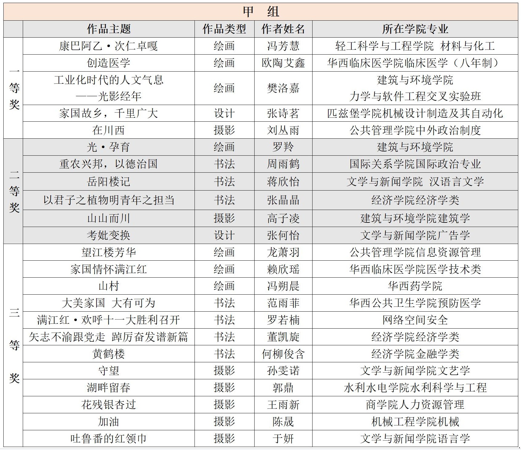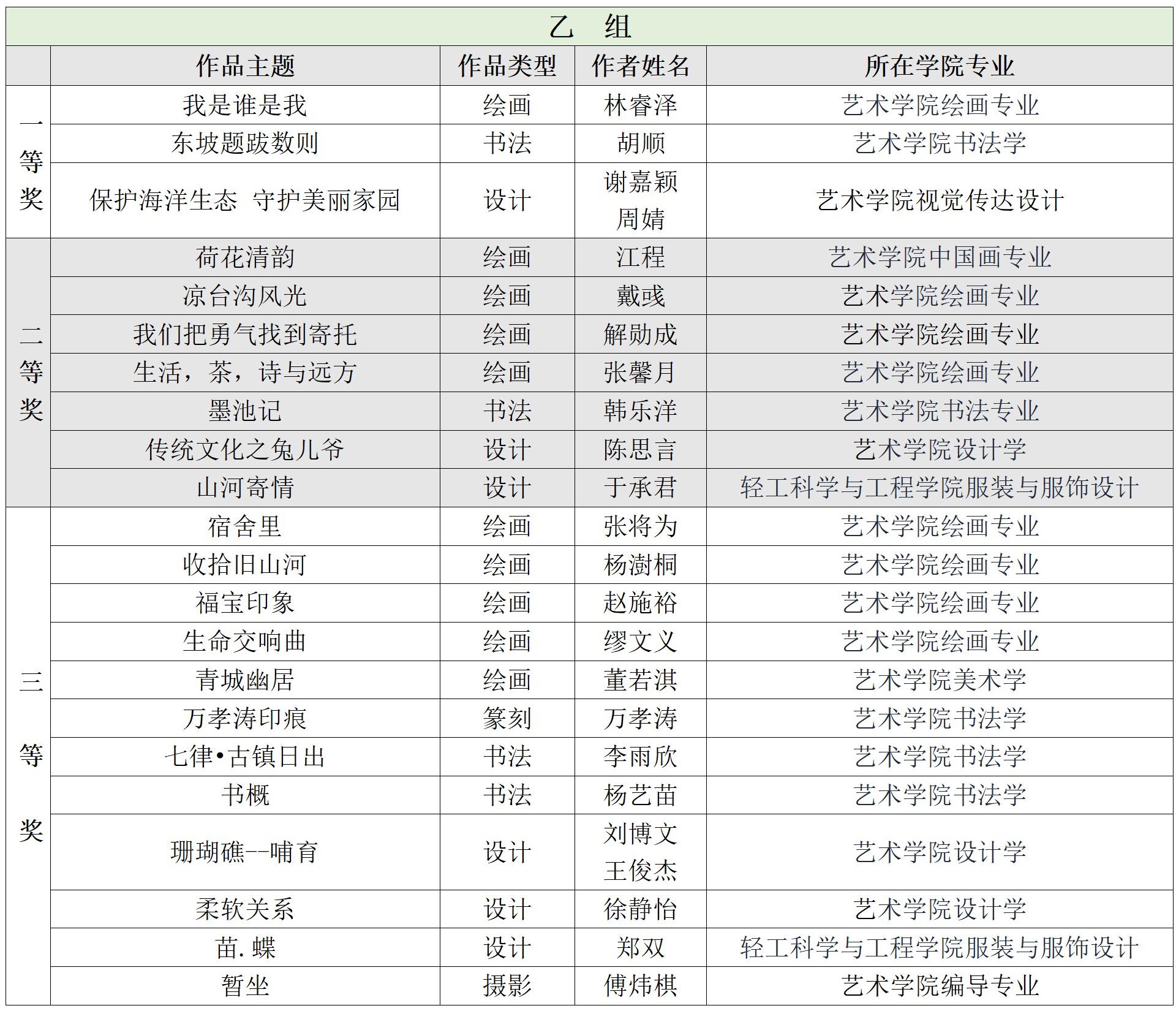 根据《四川省教育厅关于举办四川省第十届大学生艺术展演活动的通知》要求,学校党委学生工作部作为英国上市公司365美育工作办公室组织协调单位,于今年5月面向全校开展了“四川省第十届大学生艺术展演活动”校内征稿工作,其中学生艺术作品采取面向全日制在校学生征集的方式进行,总共收到绘画、书法(篆刻)、设计、摄影各类艺术作品投稿160余件。学工部会同学校宣传部、团委、教务处、研工部等相关部处,组织艺术学院相关领域专业老师,以函评方式进行初审,以会评方式组织终评,最终评选出甲组(业余组):一等奖5个、二等奖6个、三等奖12个;乙组(专业组):一等奖3个、二等奖7个、三等奖12个,现将获奖情况公布如下。