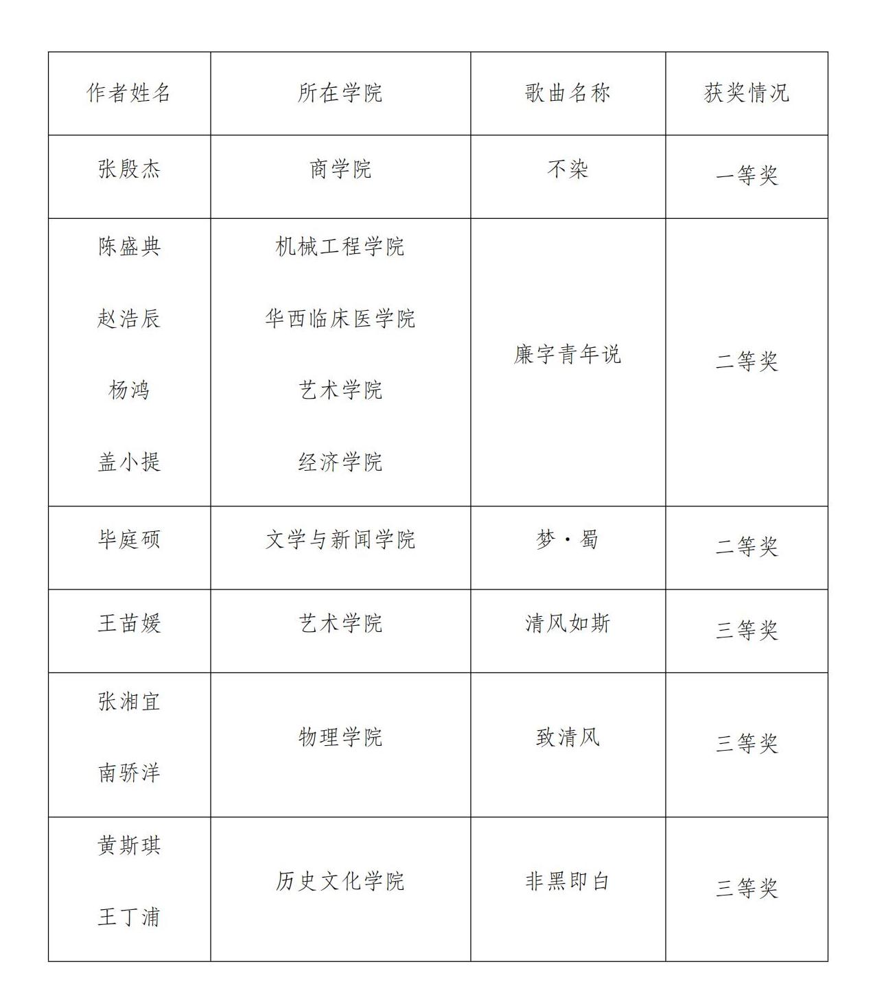 为在校内宣传、弘扬廉洁文化,以廉洁文化涵养时代新风,根据四川省第三届“510”廉洁文化宣传月相关安排,我校于近期面向全校学生组织开展了英国上市公司365“廉音传天府 清韵入校园”清廉主题原创歌曲征集活动,共收到有效投稿作品22项。学工部会同学校纪委、宣传部、校工会等相关部处,组织相关领域专业老师,以会评方式组织评审,最终评选出一等奖1项,二等奖2项,三等奖3项。经会商,拟推选《不染》《廉字青年说》两首作品参加四川省“廉音传天府”清廉主题歌曲创作比赛的省级评定。