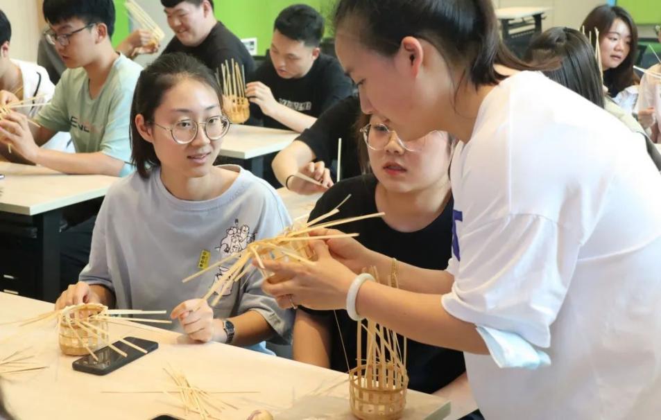 随后,杨老师现场教学编织彩条花篮,“挑二压二”的编法展现了传统技艺的魅力。同学们细心观察细节,零基础亲手体验,彩色竹丝一经一纬、一挑一穿,编出个性化创意。