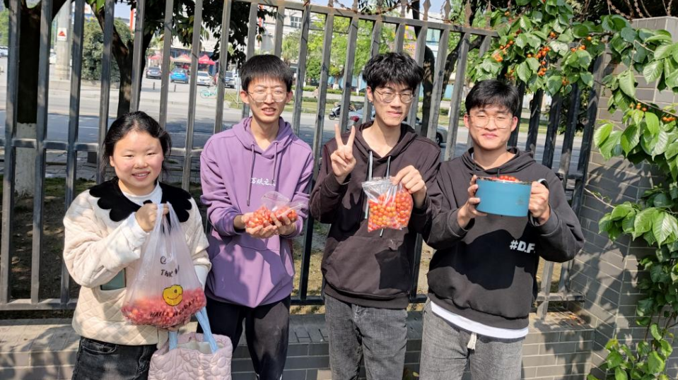 采摘结束后,同学们捧着口袋互相分享“战果”,一同品尝辛勤劳作的果实。原生态的樱桃轻咬果皮,汁水便迫不及待地流出来,香甜中掺揉着一丝儿酸味,满口生津,甚是惬意。