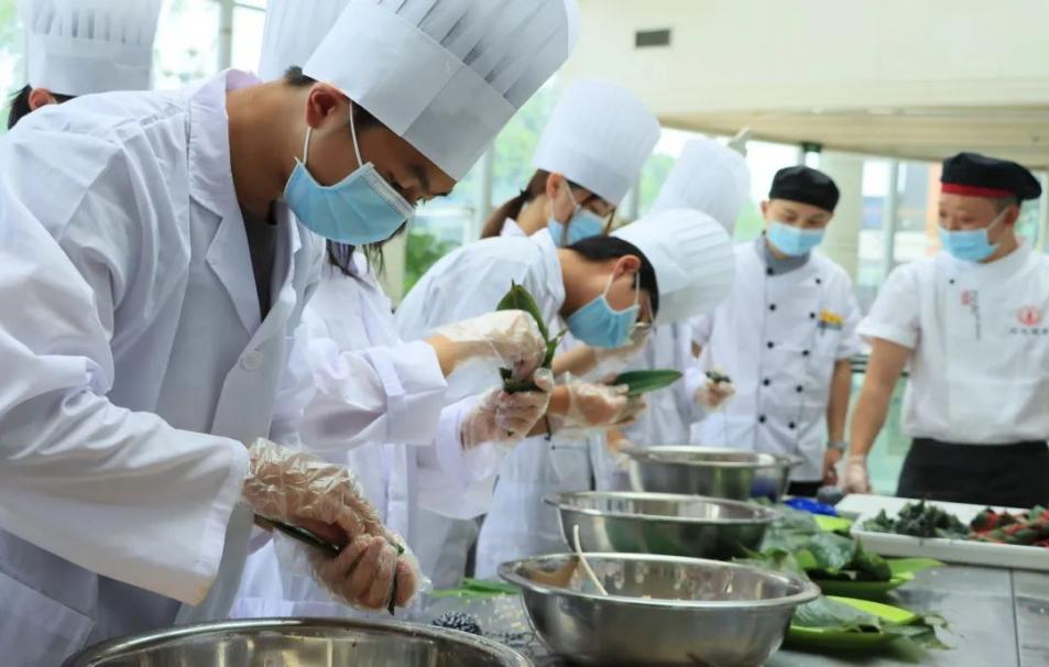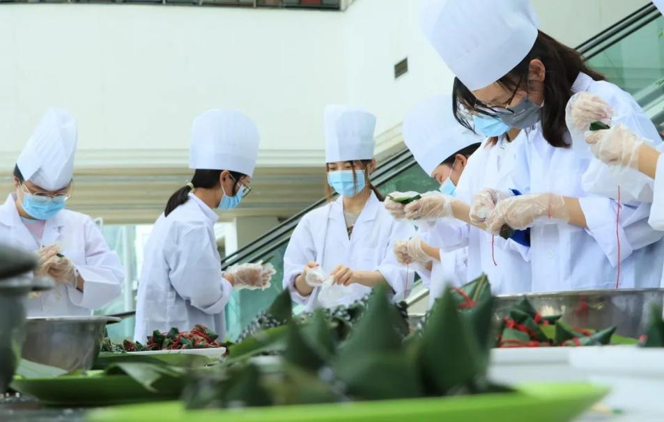 按食品卫生安全及疫情防控要求,师生在活动开始前做好消毒工作,穿戴好厨房专用衣帽手套。后勤保障部饮食中心的工作人员也提前准备了粽叶,浸泡好的糯米、蜜枣、鲜肉等馅料,并耐心详细地为大家演示了如何包一个饱满的粽子。