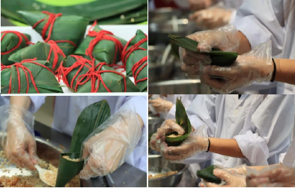 同学们纷纷上阵包粽子,后勤的师傅一边手把手的教,一边耐心交代着:“取两片叶子,光滑面朝上,稍微错开一点,唉,对的。”“把粽叶叠成漏斗状,漏斗尖对准左手食指和中指缝,加满糯米,小心漏出!”“把上面的粽叶翻过来!大拇指和无名指按紧,不要松!”“再用棉线把粽叶缠起来,拉绳扎紧系好!”。