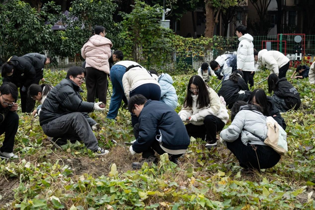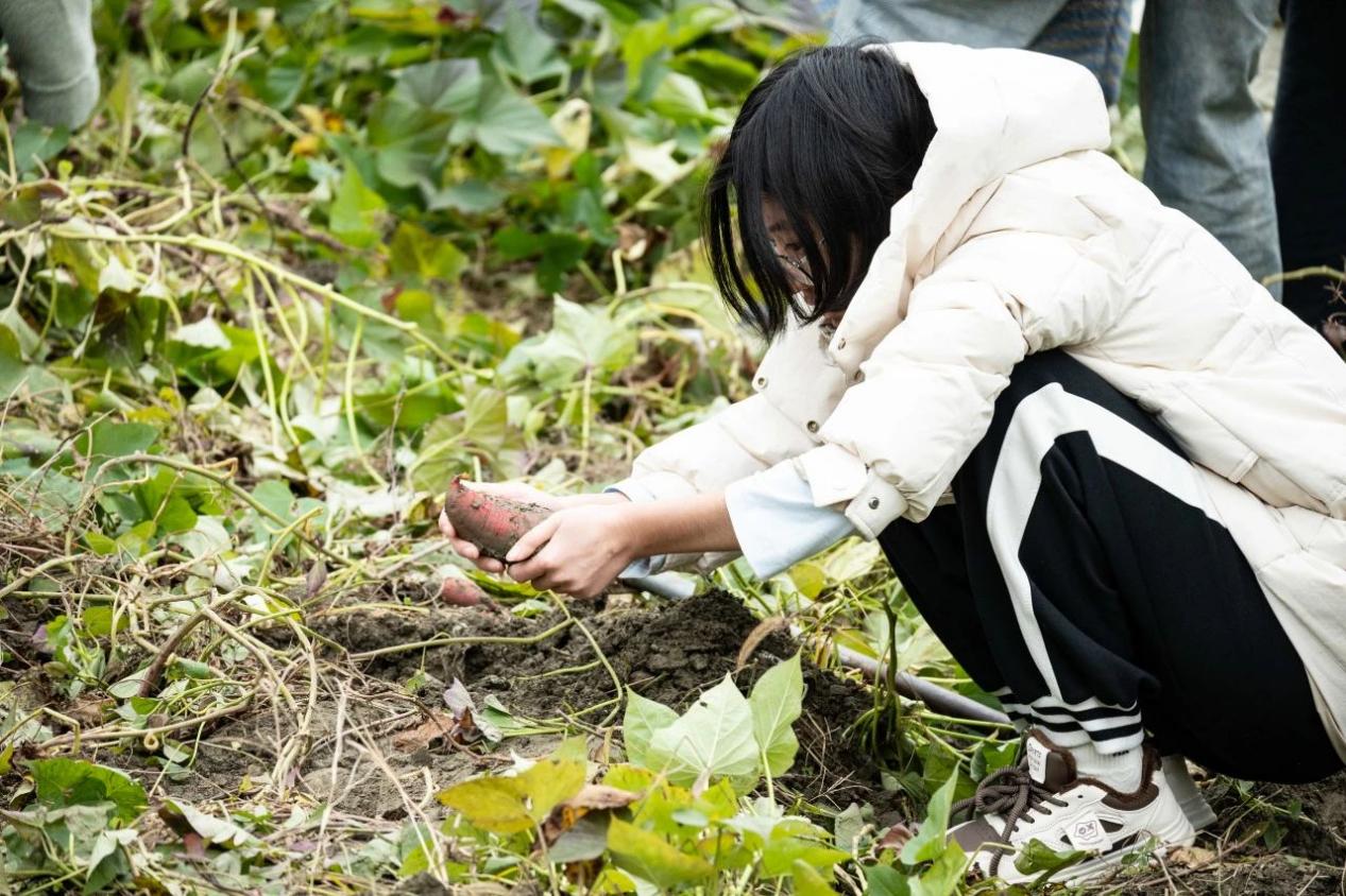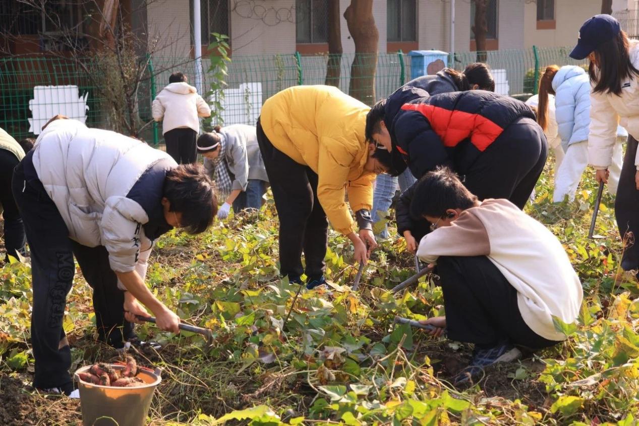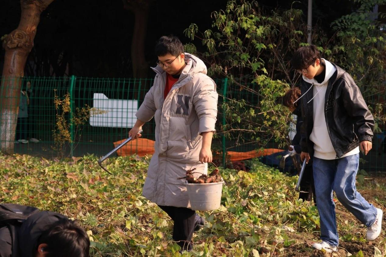 红薯从初夏的青葱翠绿,迎来了冬季丰收满盈的时刻。1400余名同学齐聚“开心农场”的田垄之间,伴随手起锄落的欢快节奏,一垄垄红薯破土而出。