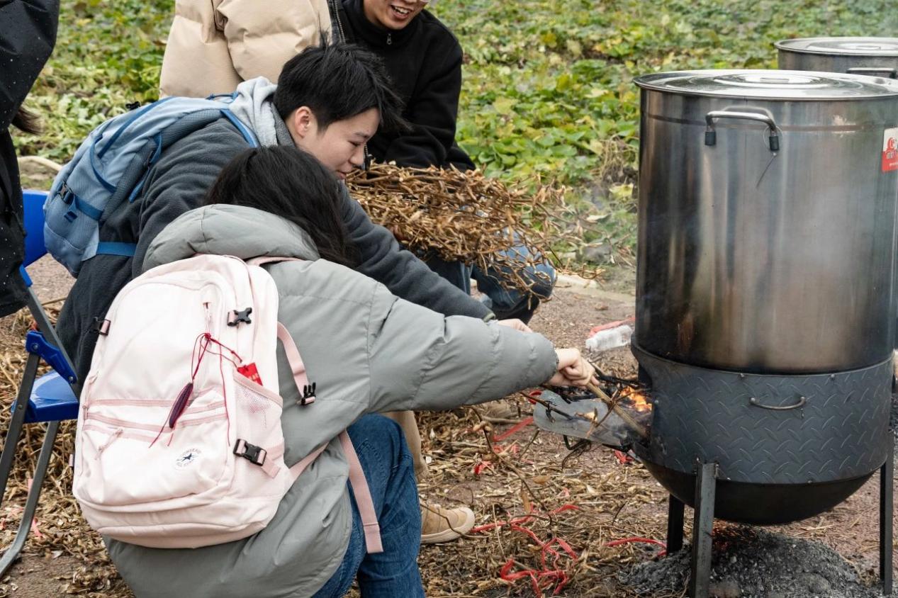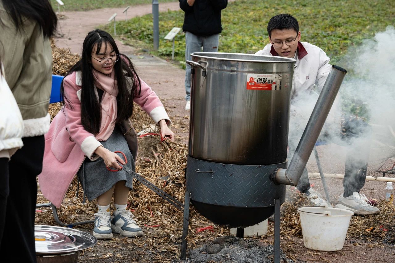 同学们围在火炉旁,一边上手琢磨着控制火候的技巧,感受农家“烟火气”,一边期待着劳动成品的新鲜出炉。本次活动烧的柴火是黄豆丰收后的豆箕,在“开心农场”,每一份劳动成果都被珍视和巧用。