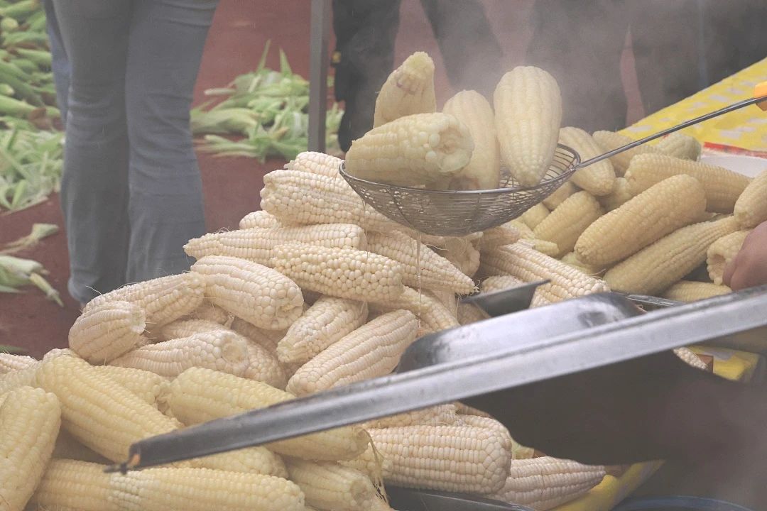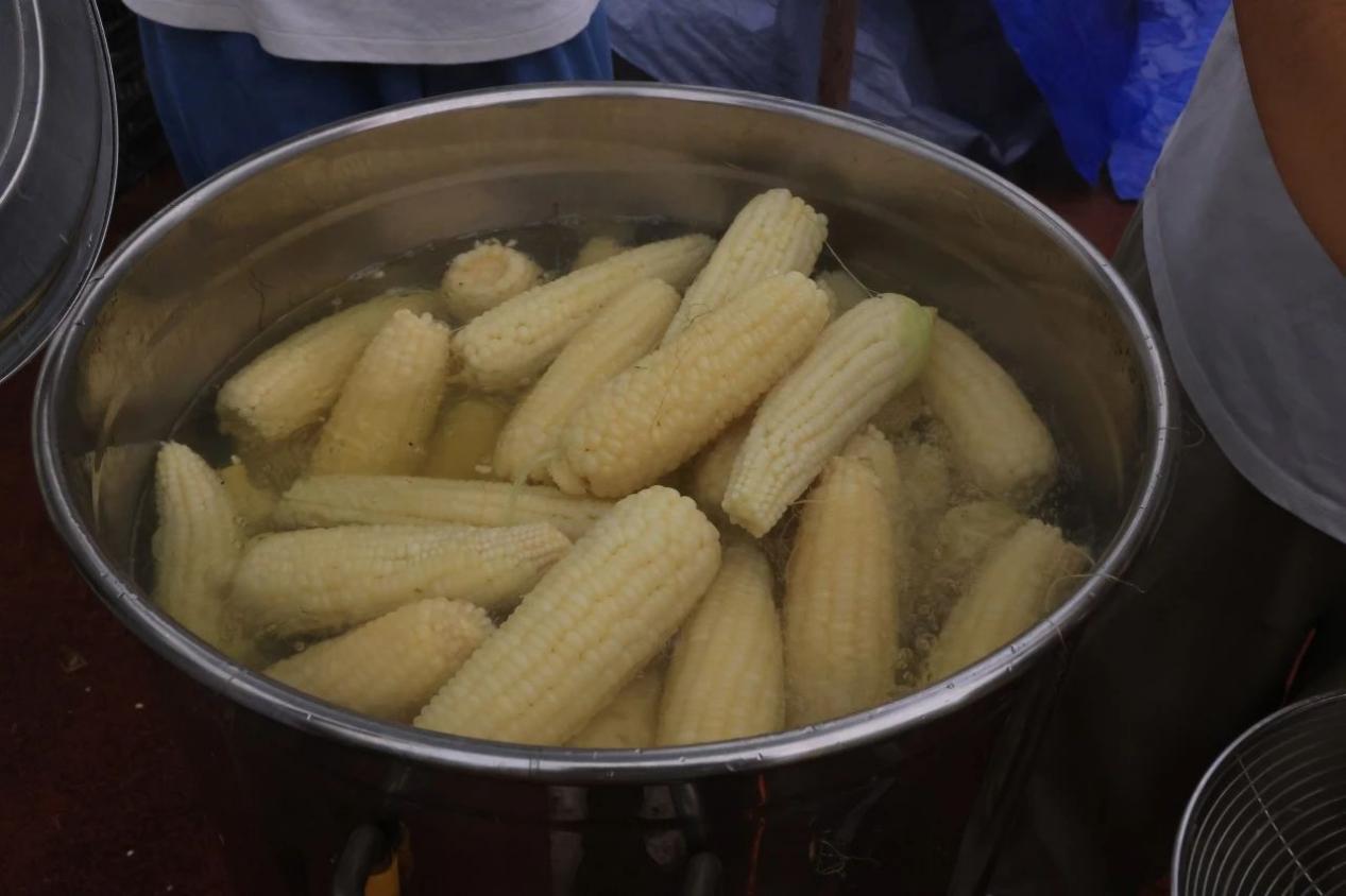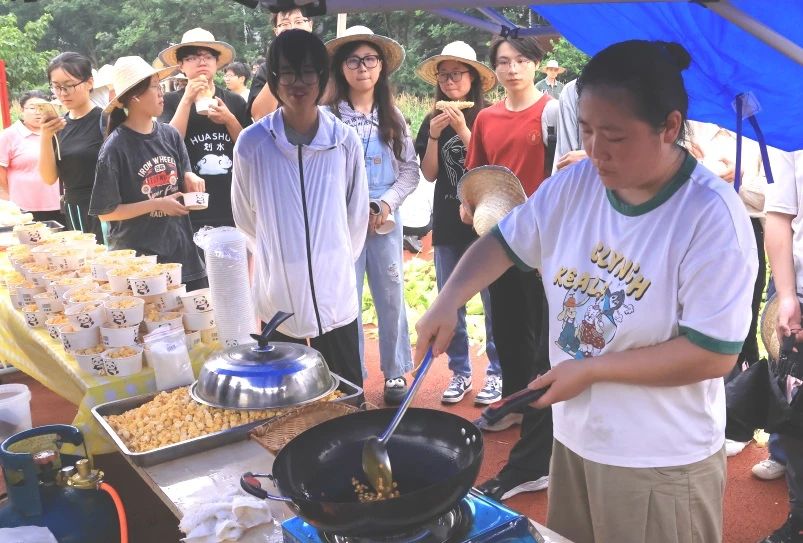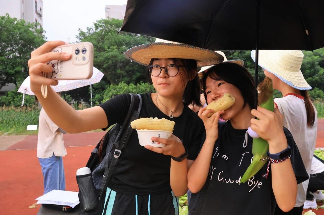 在体验和品尝的间隙,收获的鲜糯玉米已经煮熟,趁着热乎劲儿,同学们“抢”着尝鲜,一波儿“好甜”“好糯”的热评上线。