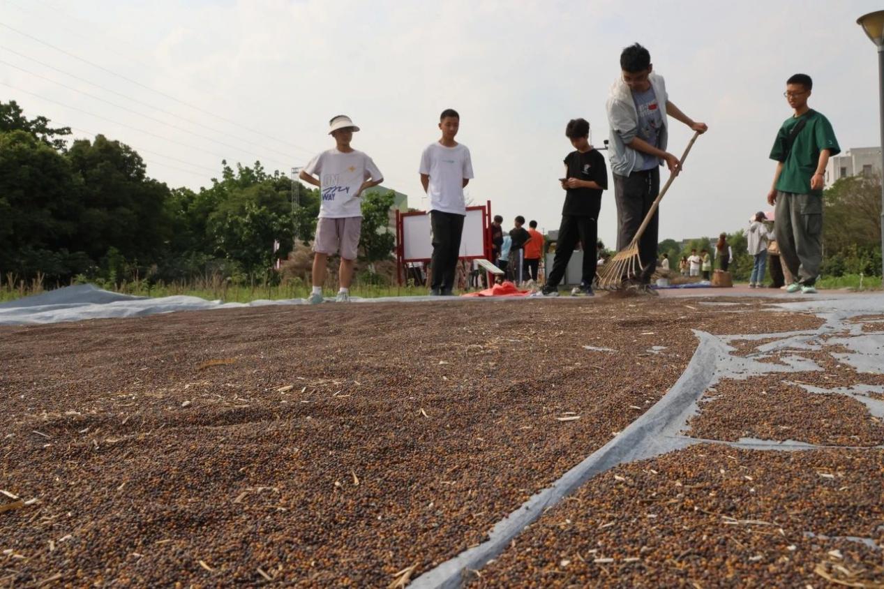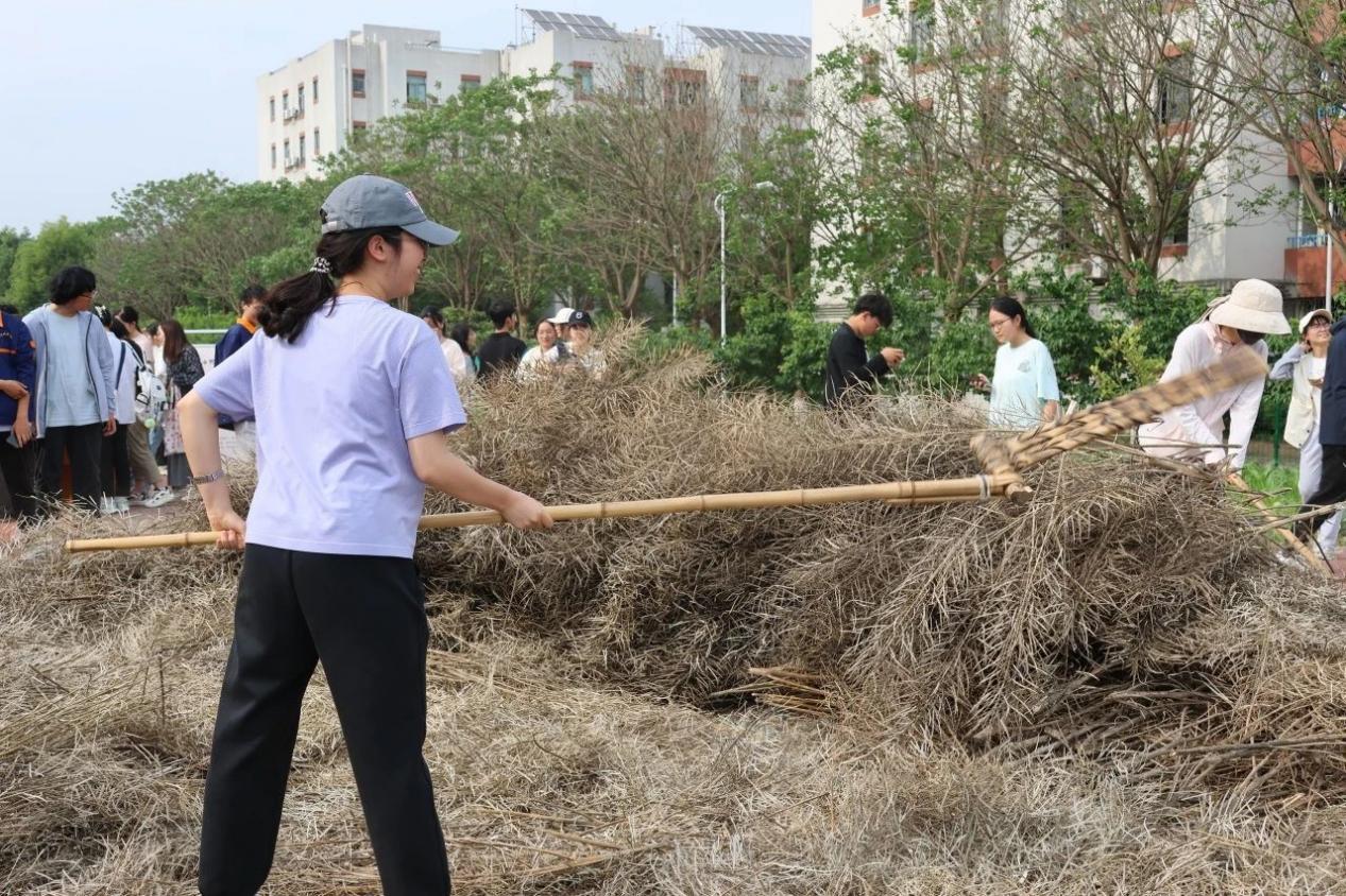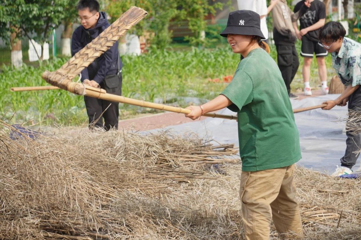 同学们摊铺好晾干的油菜秸秆,扬起连枷,顺着惯性用力向下拍打,敲打声一下接一下,节奏不急不缓,豆荚里的菜籽就乖乖地掉落下来。