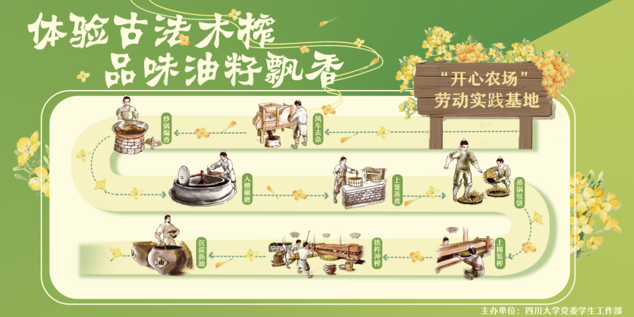 三月的油菜花海、五月的油菜籽,历经“花开浪漫风中舞”,迎来“籽结馨香鼎里烹”,花香变成果实,川大“开心农场”劳动实践基地也迎来了割油菜、打菜籽、榨菜油的夏收忙碌季!