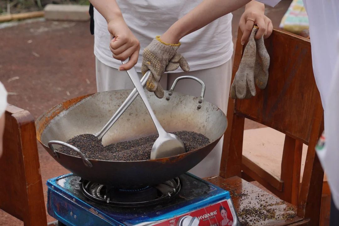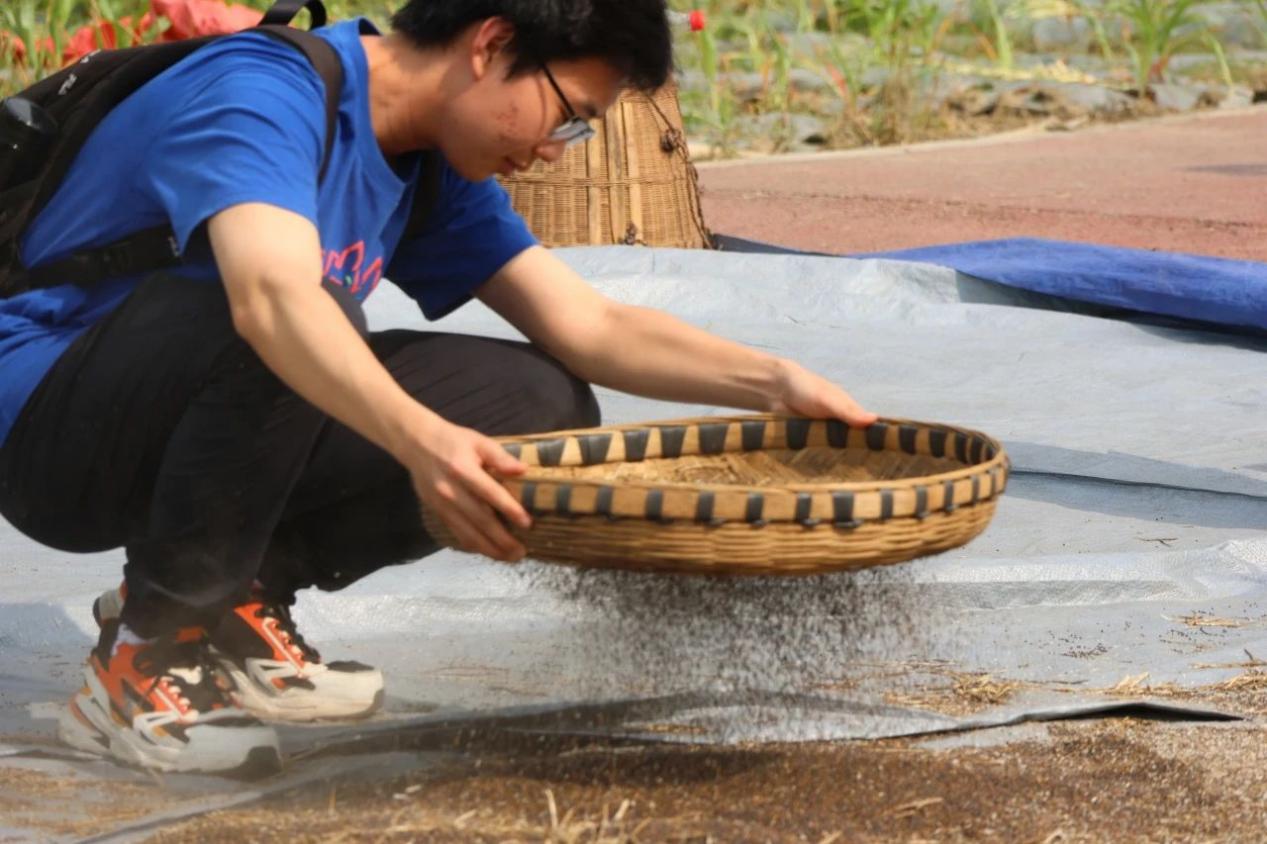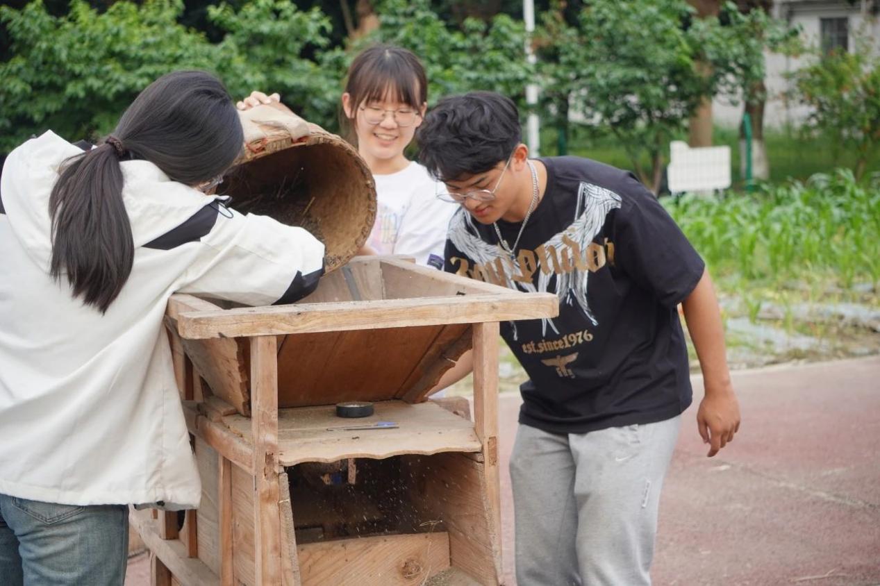 清除掉多余的秸秆和豆荚,收获饱满的油菜籽,同学们体验着“颗粒归仓”的喜悦。再利用风车去除菜籽中的浮沉与籽壳,保证菜籽油原料中不含杂质!