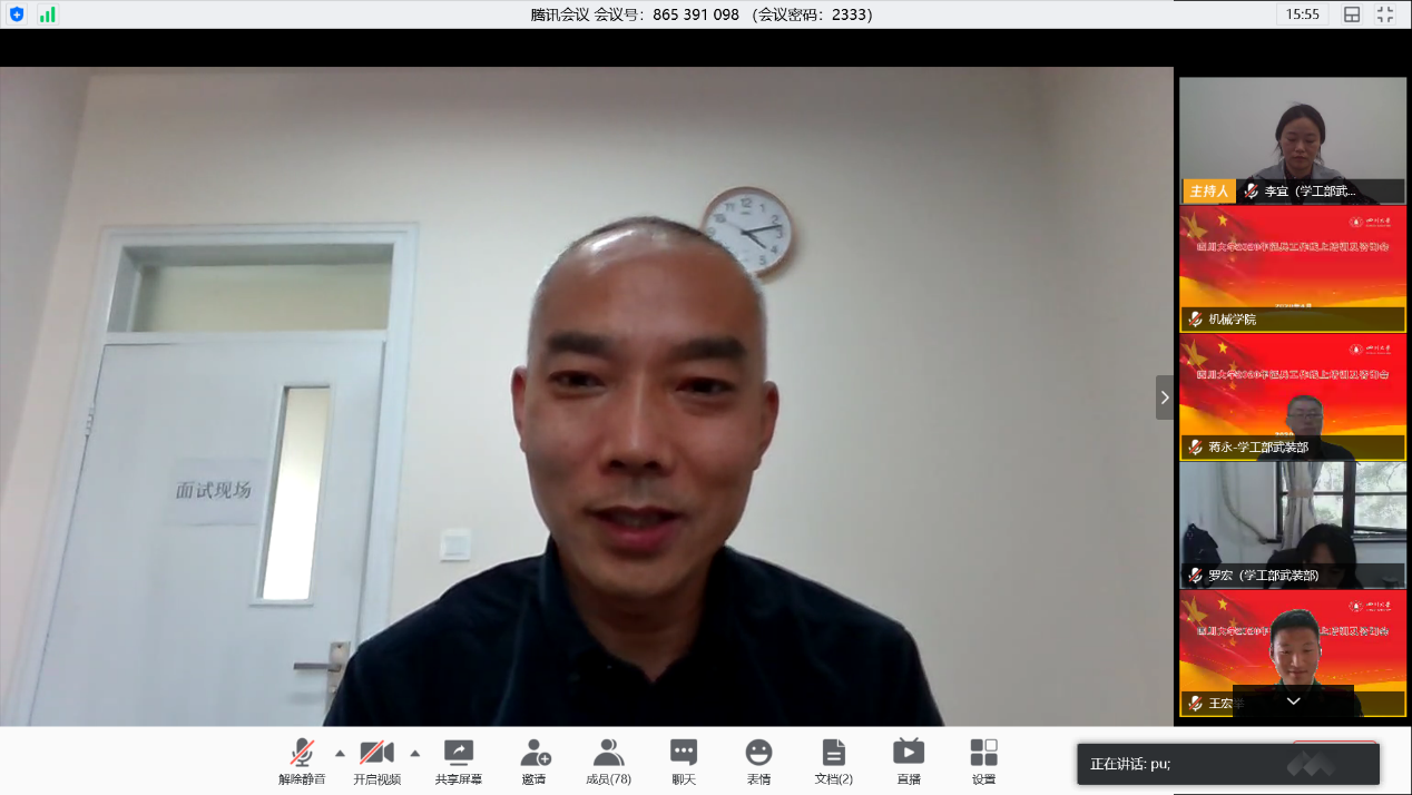 学生工作部武装部蒲于文副部长在会上对今年的征兵工作形势进行了分析,对开展今年的征兵工作提出了对策建议,要求校院两级征兵工作人员要提高政治站位,高度重视征兵工作,把抗击疫情、征兵工作、国防教育、就业工作等充分结合起来,大力加强学生爱国主义教育,把征兵宣传动员工作落细落实,全力做好应征学生的指导关心和服务工作。军事科蒋永、李宜老师分别就征兵中的一些具体政策和注意事项同与会人员进行了通报和交流。