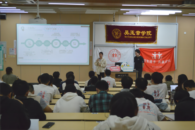 首先,通过“初识竞赛”,两位小导师将同学们引入竞赛的世界。他们谈到,参赛的第一步是要知道在哪里搜集竞赛信息,了解各类比赛的不同导向。在详细地介绍了竞赛的获知信息渠道后,两位小导师将竞赛分为综合类、基础类、专业类三个类别,并分别讲解了各类别代表性赛事的具体内容,分析了不同赛事对学生知识与能力的不同要求,帮助集聚众多专业的玉章书院同学厘清参赛方向,根据自身专业和个人特长,选择参加匹配度高的竞赛。
