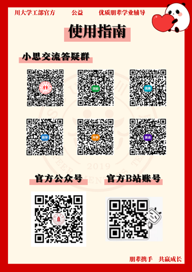 “大川小思”朋辈学业导师通过5大主题学习QQ群、3个“大川小思”信息发布平台大群、“SCU思学”微信公众号、“SCU大川小思”QQ号、“SCU大川小思”bilibili账号等线上朋辈学业辅导答疑平台,并结合线下一对一咨询、团体学业辅导、助力川大学子有效学习,共同成长。