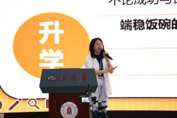 最后,升学组朋辈导师华西临床医学院20级学生张智萌同水利水电学院22级硕士生李宇灏同学带领同学们从零开始了解大学升学。张智萌同学形象地以“披荆斩棘”为喻,从升学是什么和为什么要升学,消除新同学们在面向未来时对于升学之路的迷茫和疑虑,她建议同学们一定要抓住本科阶段的诸多尝试机会,去了解自己到底想要什么。李宇灏同学则讲解了保研、考研和留学三条升学路径的异同。他说到,“较好的课程学分绩点、英语(外语)数学水平、一定的学术能力、提前规划”是未来通向升学之路的通用“通关秘籍”。同时,他希望同学们不必执着于未来的升学目标,“苔花如米小,也学牡丹开”只要大学里尽心努力,结果自然水到渠成!最好的风景在路上!