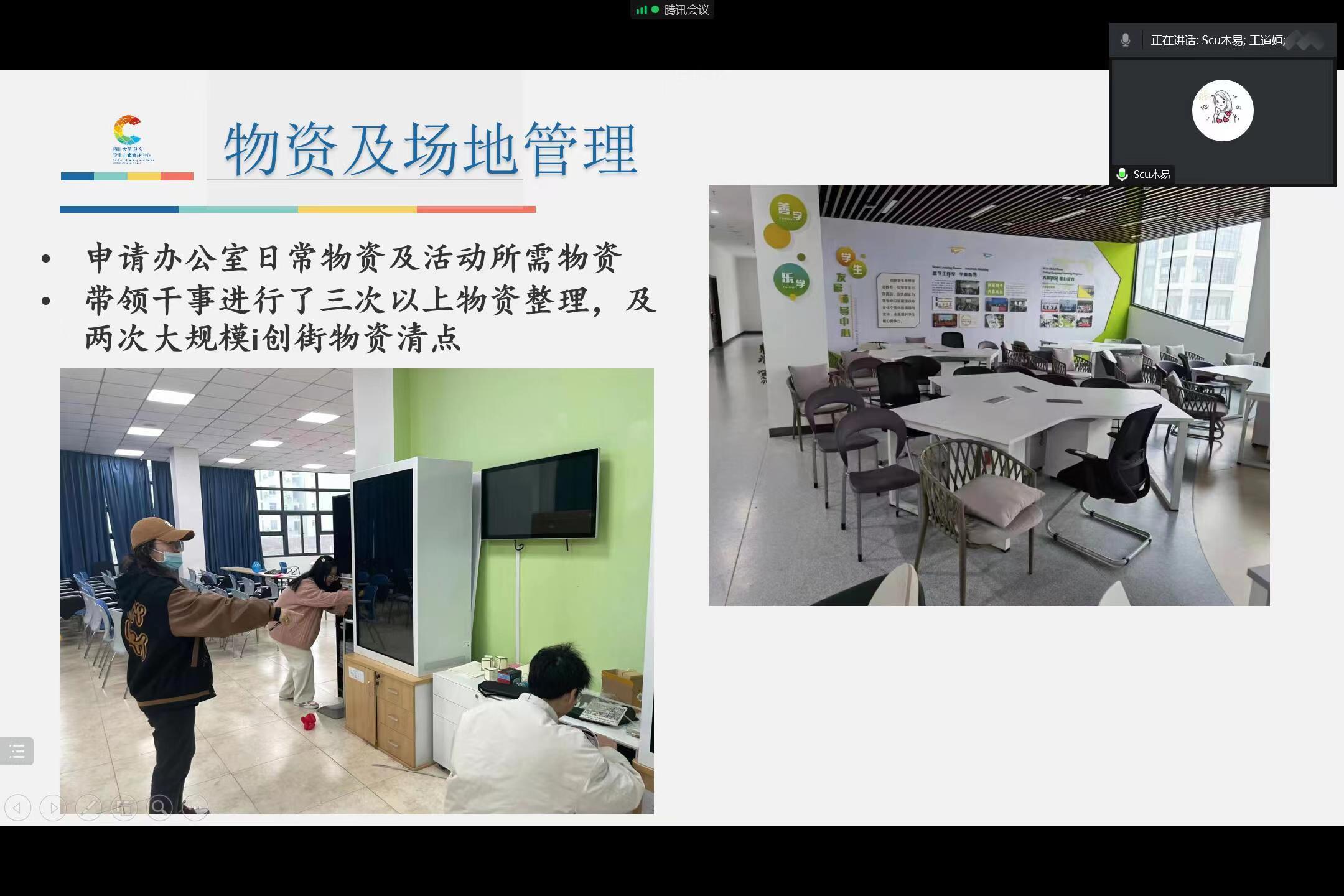 随后是创小管主席与各部门部长带来的学年工作总结。这一年中,办公室策划举办了两次创小管全体大会暨团建,并负责完成创小管财务信息、物资场地的整理与管理及对外接待工作;活动部策划举办了i创嘉年华、i创市集、锦绘中国等大型校级双创活动;创拓部协助完成了i创街店铺入驻答辩与中期答辩,同时完成了对i创街店铺与工坊的定期检查、投诉处理等工作;编辑部完成了各类双创活动的新闻稿撰写、入驻团队采访、创小管工作月报与《吾双2022》杂志编制工作;宣传部准备了所有双创活动与团建的宣传物料,并负责公众号运营;外联部持续进行对外联络工作、并举办两场“小管有话说”-创新创业指导讲座。