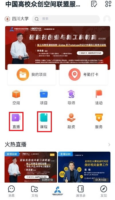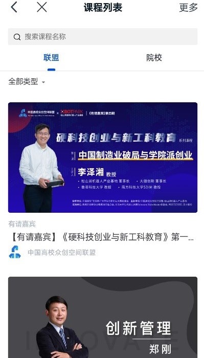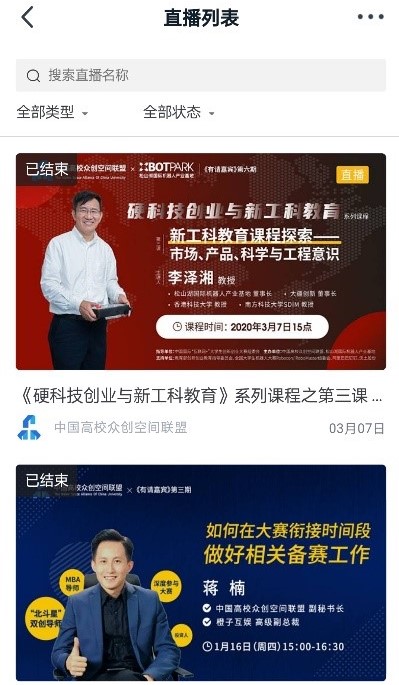 在“中国高校众创空间联盟”模块下,可点击“直播”、“课程”等进行线上学习。直播教学内容结束后,亦可进行视频回放观看。