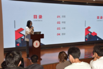蒋岸汀兰以个人的参赛经历为例,为大家介绍了“大创”申报题目的确定、如何组队、大创项目的进度要求、结项答辩考核等方面,并建议同学们充分运用新媒体工具获取相关信息,遇到困难主动求助指导老师和同学。在“大创”结项答辩方面,蒋岸汀兰给出了自己关于制作PPT、讲稿和应对问答方面的建议。