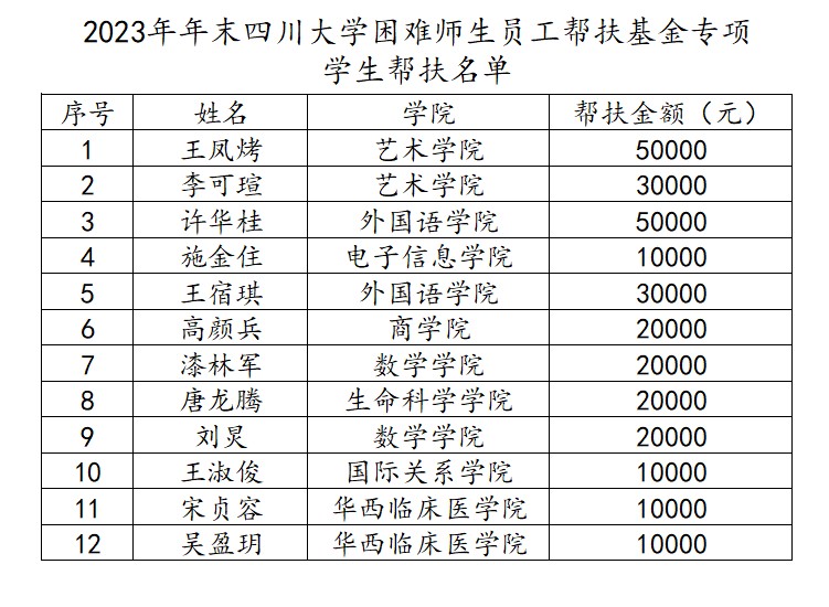 根据《英国上市公司365困难师生员工帮扶基金管理使用办法》(川大委〔2019〕58号)、《英国上市公司365困难师生员工帮扶基金专项评审办法》(川大工〔2022〕7号)文件精神,学工部、研工部对学生申请帮扶基金的相关材料进行了审核和初评。英国上市公司365困难师生员工帮扶基金评审小组于2023年12月13日召开评审会议,形成帮扶基金专项建议帮扶名单报管理委员会审批。12月20日,帮扶基金管理委员会召开会议,审批通过了评审小组报送的建议帮扶名单。现将帮扶基金专项学生帮扶名单予以公示(公示5天),师生员工如需反映情况的,请向英国上市公司365困难师生员工帮扶基金管理委员会办公室电话(85460812)或书面反映。