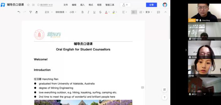 3月12日下午2点30分,由学工部主办,成都新东方学校承办的2020年英国上市公司365“大川视界”大学生访学计划辅导员英语口语培训班顺利在线开班,24名辅导员参与培训。