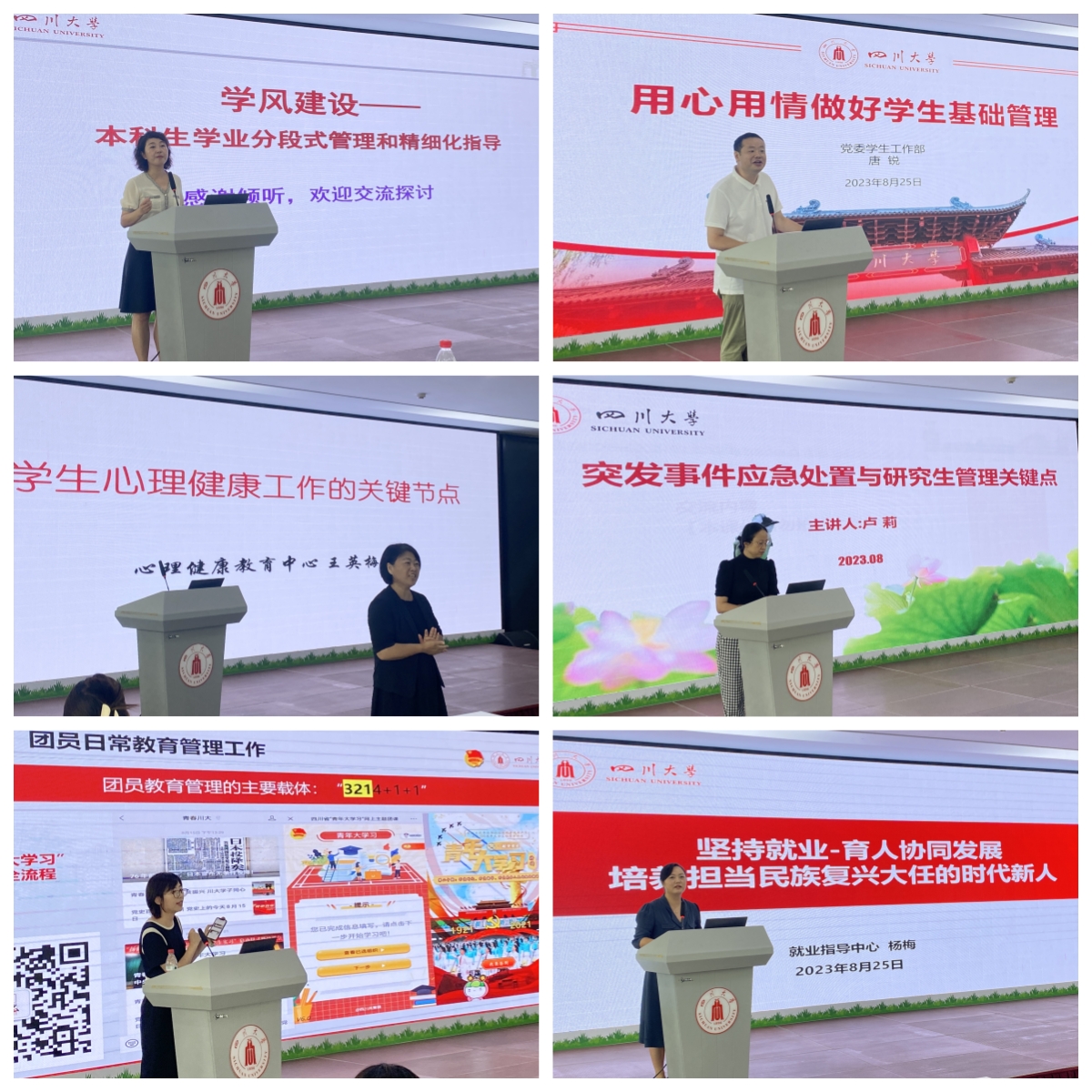 学生工作部副部长黄菲娅、唐锐,心理健康教育中心主任王英梅,研究生工作部副部长卢莉,校团委副书记吴菁及就业指导中心副主任杨梅,依次围绕学风建设、学生基础管理、学生心理健康工作、突发事件应急处置、新生团员教育管理、就业育人协同发展等主题,进行了工作实操能力培训。学生工作部副部长李佳伟围绕江安校区学生管理模式组织开展了现场工作研讨,建筑与环境学院辅导员王天泽等5名辅导员结合实例分享低年级学生服务管理经验。