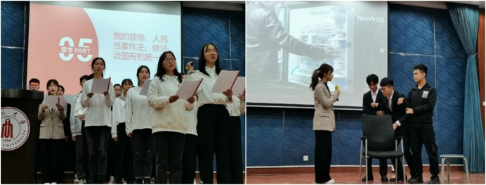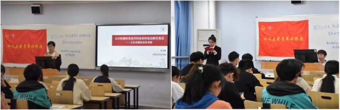 组织青年讲师团面向学生社区开展“学习二十大、永远跟党走、奋进新征程”主题宣讲活动。结合学院专业特色,采用包括马克思主义理论、法学、历史学在内的跨学科研究视角和方法,聚焦党的二十大报告中“以中国式现代化推进中华民族伟大复兴”“中国式现代化是全体人民共同富裕的现代化”“分配制度是促进共同富裕的基础性制度”等论述进行分析和阐发,以立法史梳理为载体论证改进分配制度促进共同富裕的宪法路径等问题。青年讲师团帮助同学们站在法学视角重新看待共同富裕道路的理论架构和实践路径,引导新时代青年学生在促进共同富裕的目标引领下,进一步发挥自身学科优势和青春力量建设美丽中国。