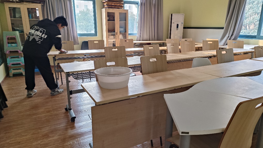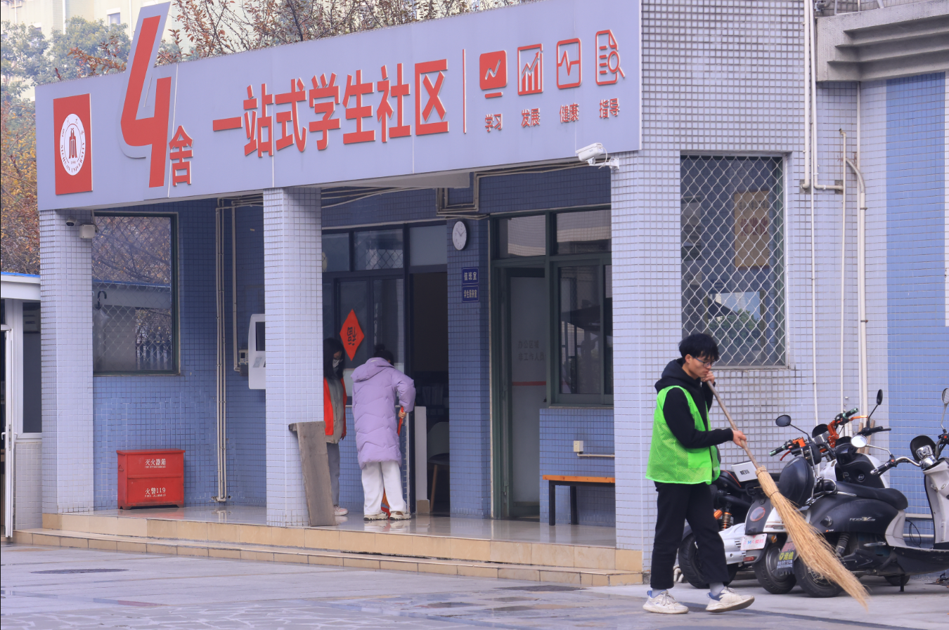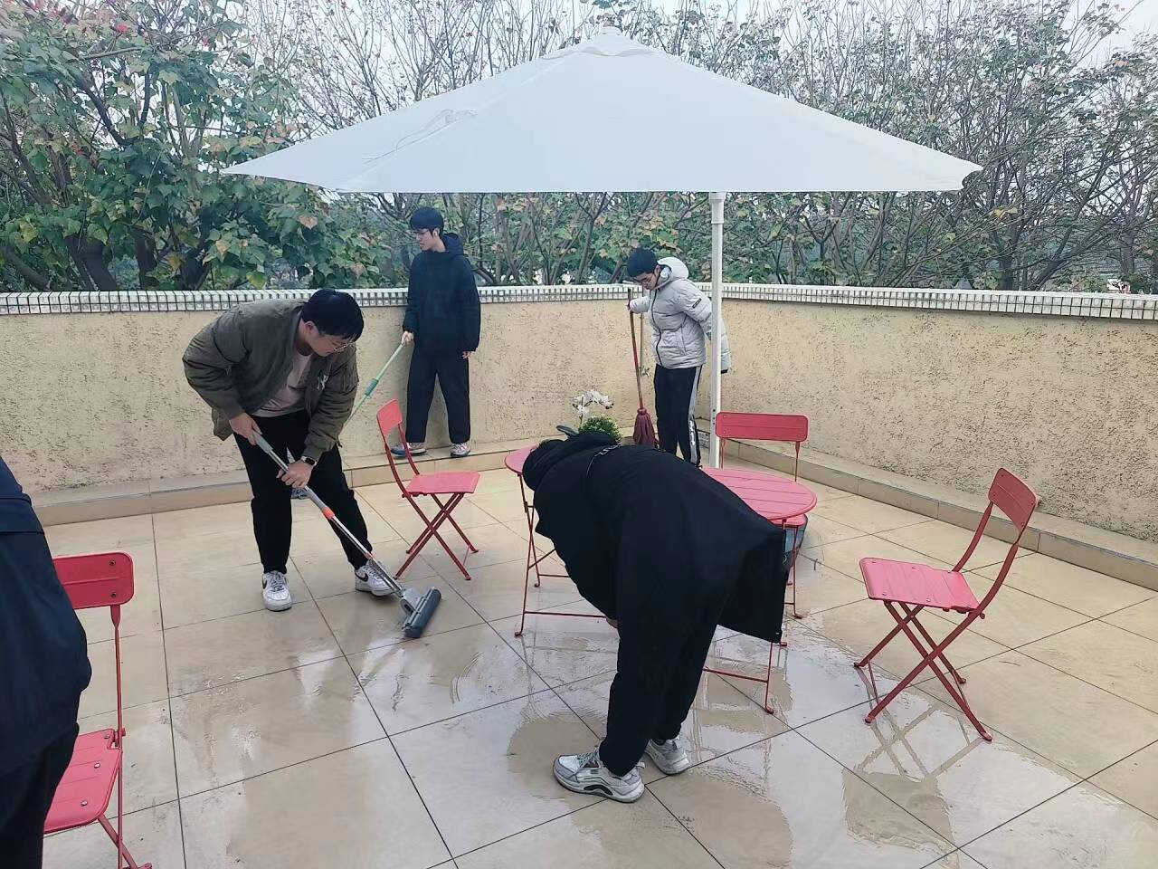 元旦假期第一天,学生社区一派洒扫除尘迎新年的忙碌场面,师生默契协作,捡拾垃圾,规整公物,擦拭门窗......经过辛勤劳动,整个“一站式”共享空间焕然一新,“元”气满满。